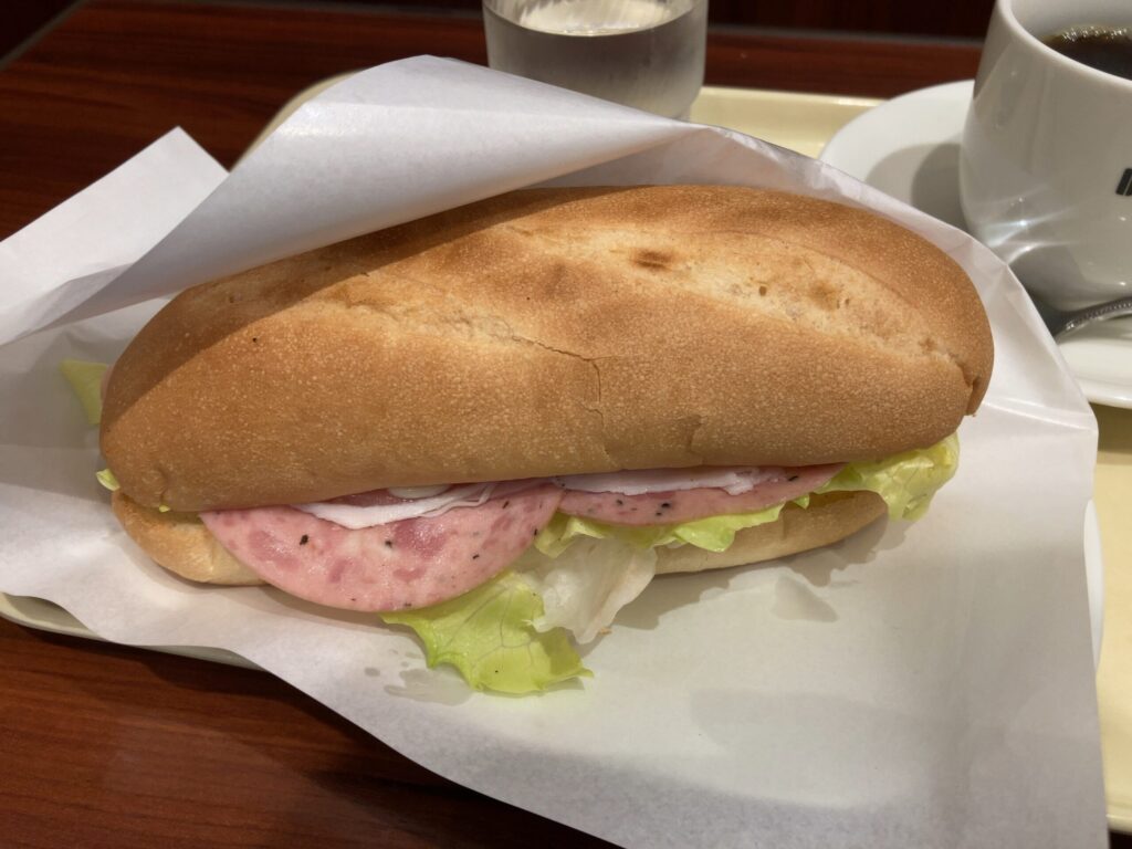 美味い。ハムとソーセージの塩気とレタスのシャキシャキ感とパン生地のバランスが絶妙。以前にチーズ in ミラノサンドA 生ハム・ボンレスハム・ボローニャソーセージ¥550 を食べた時に美味くて大満足だった。それより60円安くてチーズが入っていないので少し物足りないのかなと思って食べてみたらこっちも美味くて満足でした。アメリカンコーヒーとの相性も良し。