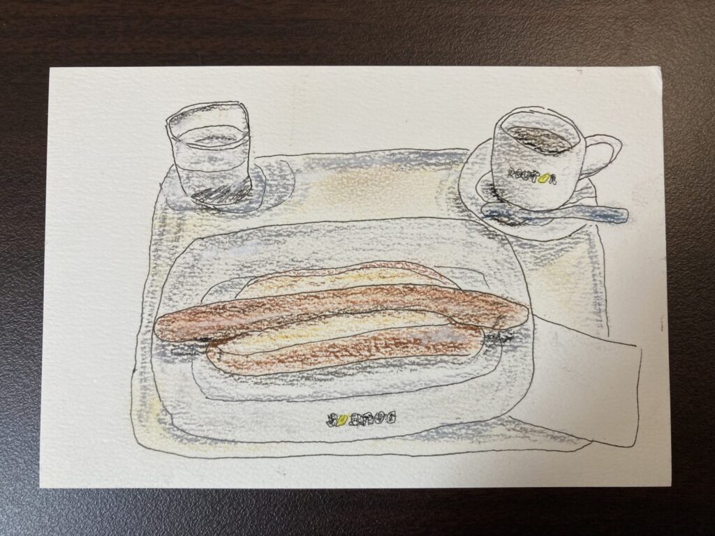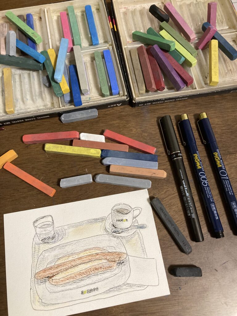 ミリペンとパステルで絵を描いてみた。しずおの好きなドトールの絵です。(ジャーマンロングドッグとアメリカンコーヒー)今回はミリペンで下絵を描いてその上からパステルで色付けしました。