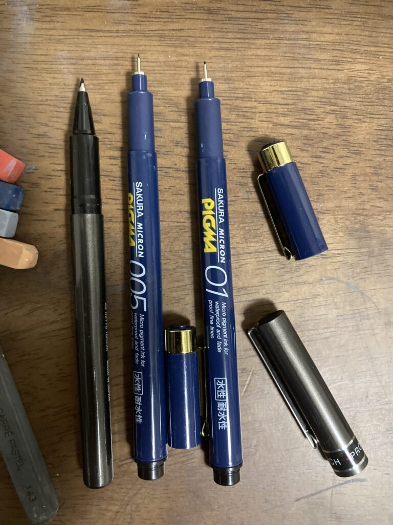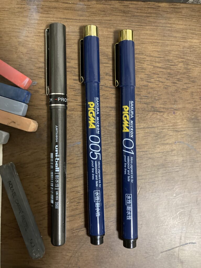 水彩絵の具向けに耐水性の買いました。今回はパステルなので耐水性でなくてもいいです。0.05はかなり細いです。普通に描く分には左のやつで十分です。
